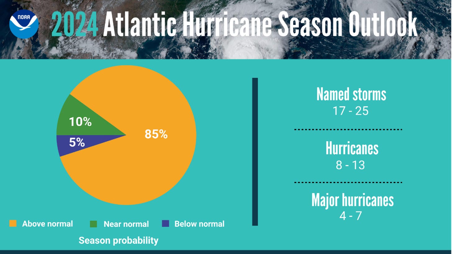 Hurricane season: Forecasters at NOAA predict that the 2024 Atlantic hurricane season, which spans from June 1 to November 30, will have an 85% chance of an above-normal season.
