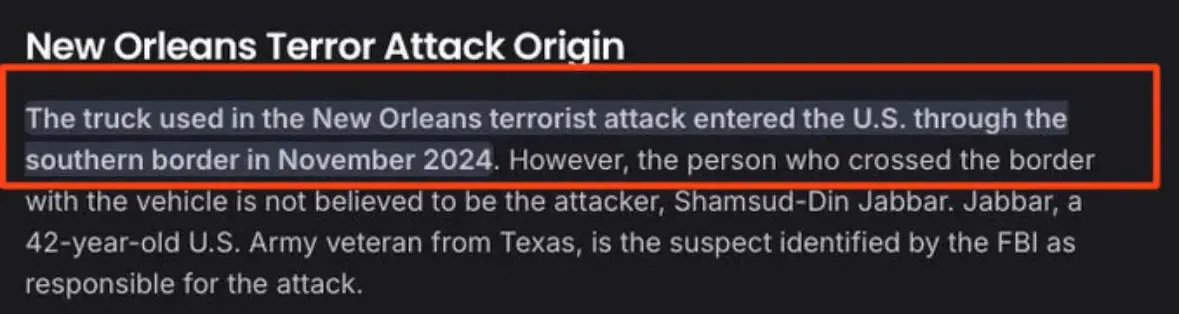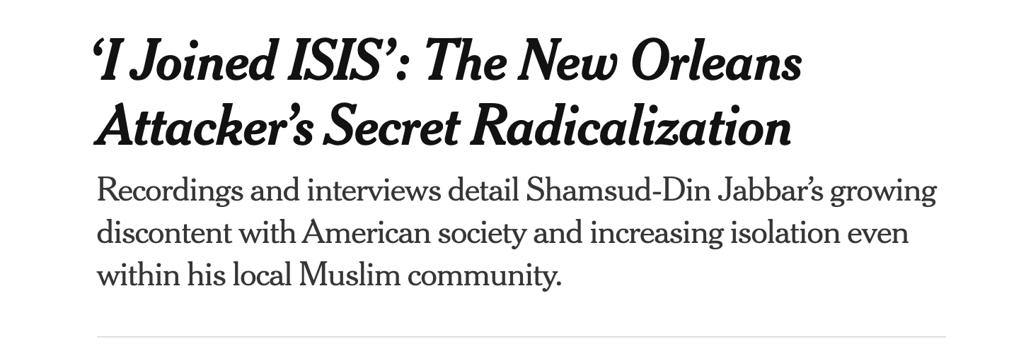 As the misinformation subsided, a different narrative emerged: the specter of ‘radical Islamic terrorism.’ Social media users displayed Din Jabbar’s ISIS flag that was on his truck, his intention to kill more people, and the police finding explosive devices across Bourbon Street. Mainstream news outlets soon shifted their focus to Jabbar's radicalization and his story.
